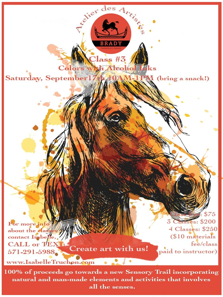 Brady’s Equine Art Program developed by Artist Isabelle Truchon is open to children from 8 to 99. Participants are exposed to a variety of media and fun hands-on techniques in a natural equestrian environment. Each class tackles a project from start to completion. The atmosphere is fun and non-competitive, encouraging exploration and observation. Each class is 3 hours long, with breaks. All materials are included with the $10 materials fee.